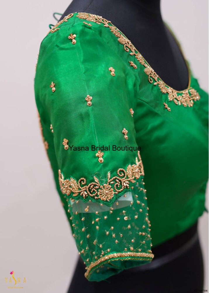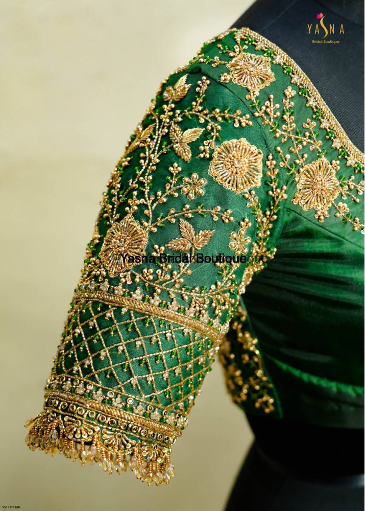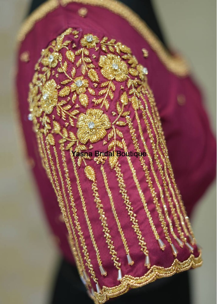 silk blouse adorned with intricate golden embroidery and floral motifs, exuding a regal bridal charm. The sleeve features delicate beadwork and a fringed lace border, adding an elegant finishing touch.