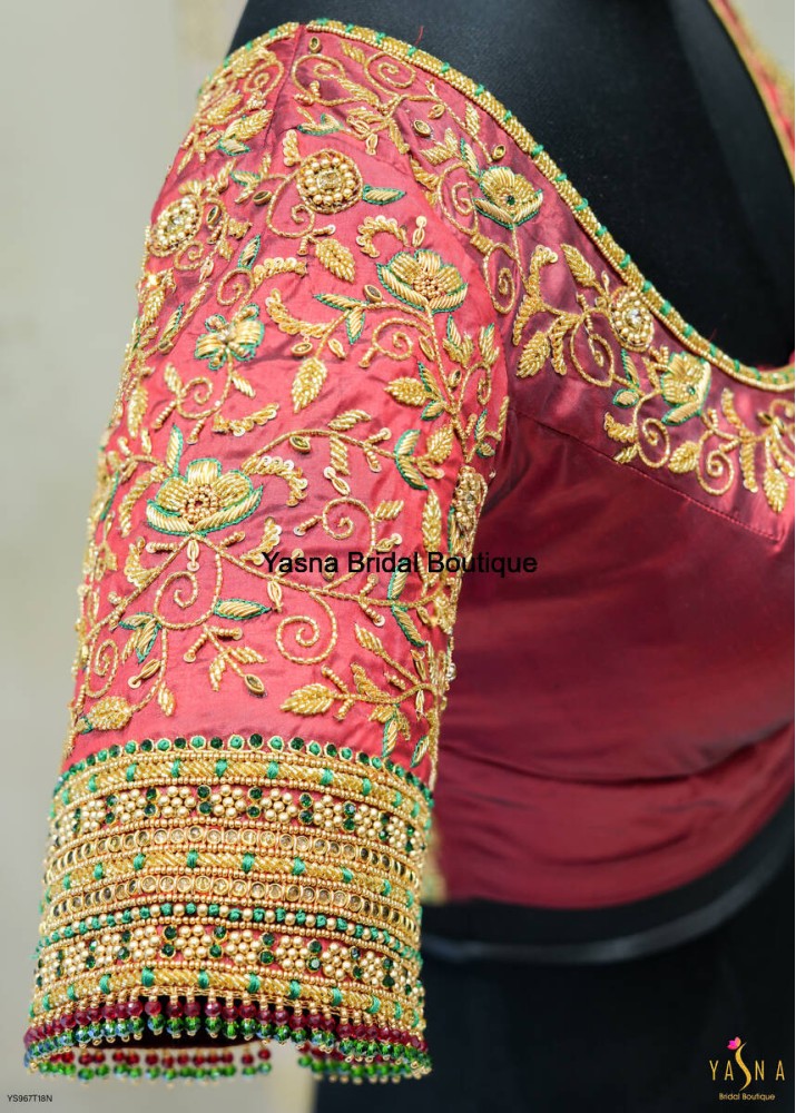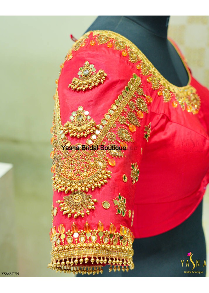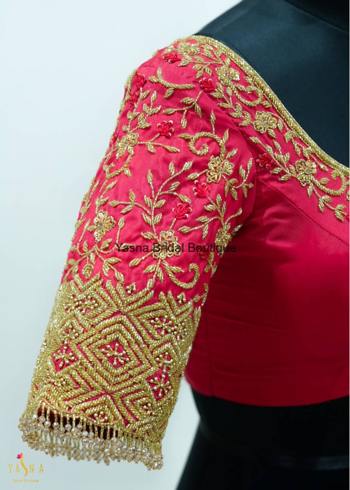 A vibrant Red bridal blouse beautifully detailed with intricate golden threadwork and floral motifs. The sleeve showcases a grand geometric zari design with bead tassels, creating a luxurious and regal finish.