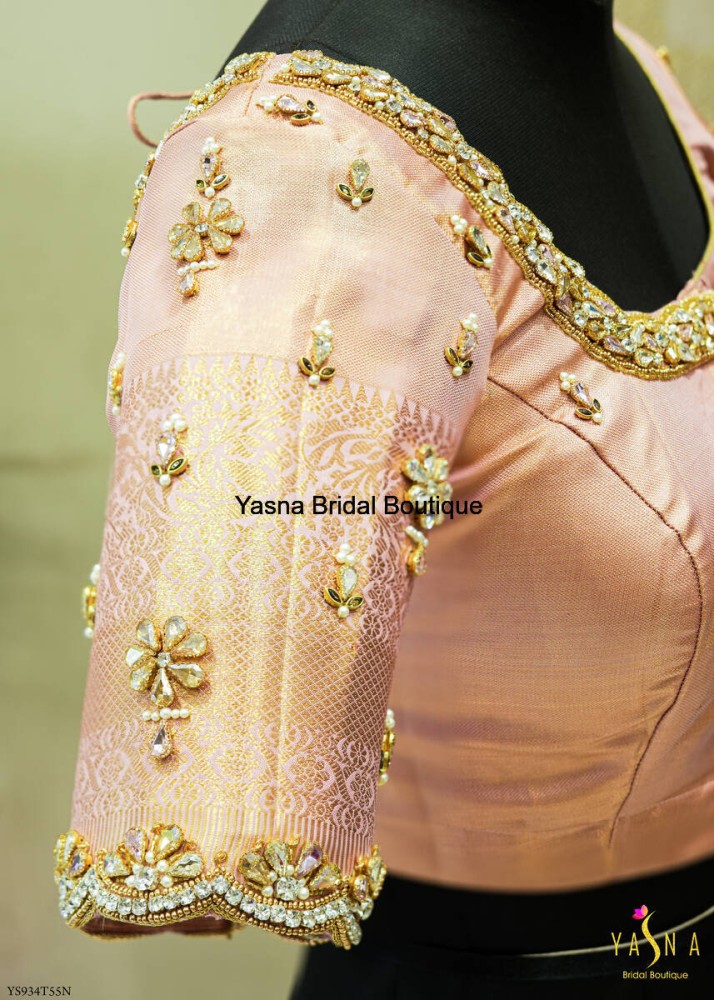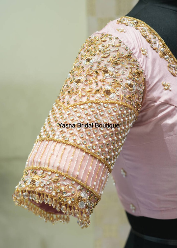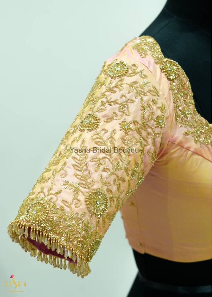 A pastel pink silk blouse adorned with intricate golden embroidery and floral motifs, exuding a regal bridal charm. The sleeve features delicate beadwork and a fringed lace border, adding an elegant finishing touch.