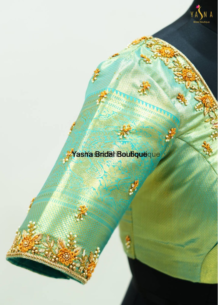 A serene turquoise blue blouse embellished with delicate golden floral embroidery for a refined look. The sheer organza sleeve with scattered motifs and detailed border adds a soft, elegant charm.